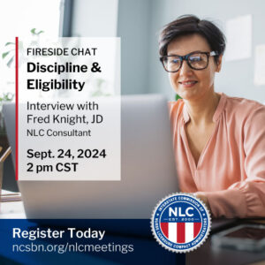Join our Fireside Chat on Sept. 24 from 2-3 pm CST for a discussion on discipline, eligibility for a multi-state license and disqualifiers to a multistate license. Fred Knight, JD, NLC Consultant, is the interview guest. Register here: https://nursecompact.com/stay-informed.page #NurseCompactNation.